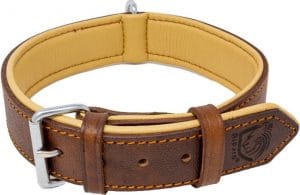 With its padded split leather lining, this dog collar is sturdy, comfortable, and stylish. Made from 100% genuine full-grain leather, it’s water-resistant and won’t collect dog hair.
